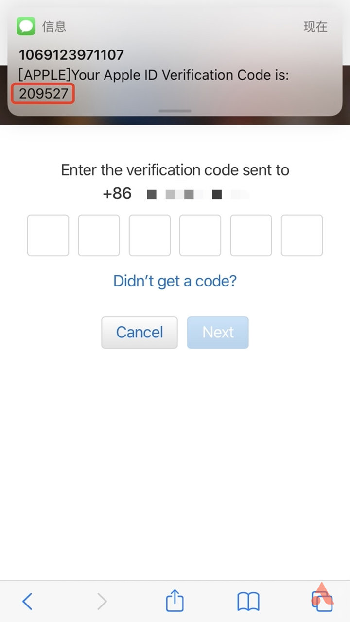 5、最后,我们的手机会受到 Apple ID 验证码,我们输入过后点击 next,成功提交过后,我们的美国 id 就算注册完成了。