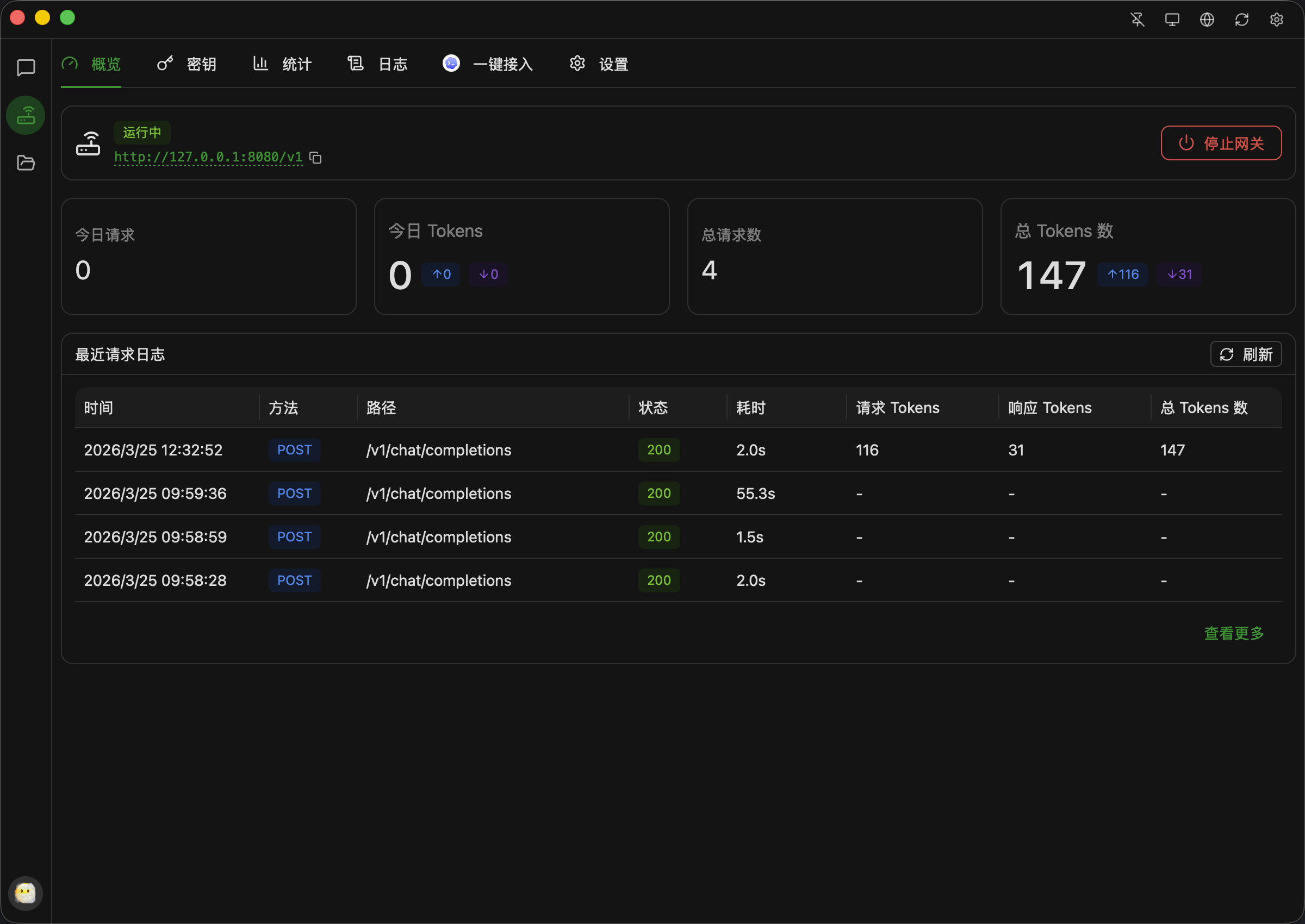 本地 API 网关 — 内置 OpenAI 兼容、Claude、Gemini等原生接口的本地 API 服务器,可作为任意兼容客户端的后端